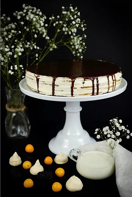 A light and airy cake with delicate honey-flavored layers, soaked in fluffy cream and covered with a glossy chocolate glaze.